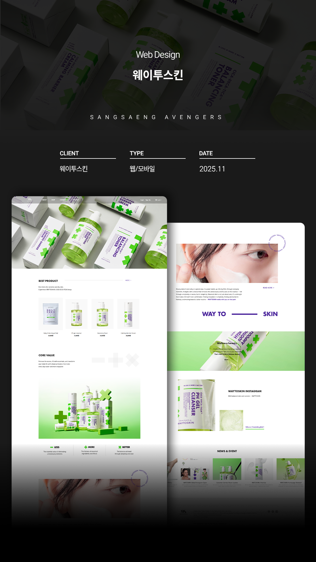 [홈페이지] 웨이투스킨글쓴이 SSAVENGERS / 2025년 11월 27일 웨이투스킨의 해외 제품 홍보 및 브랜딩을 위한 영문 홈페이지를 디자인 및 제작하였습니다. 사이트 바로가기