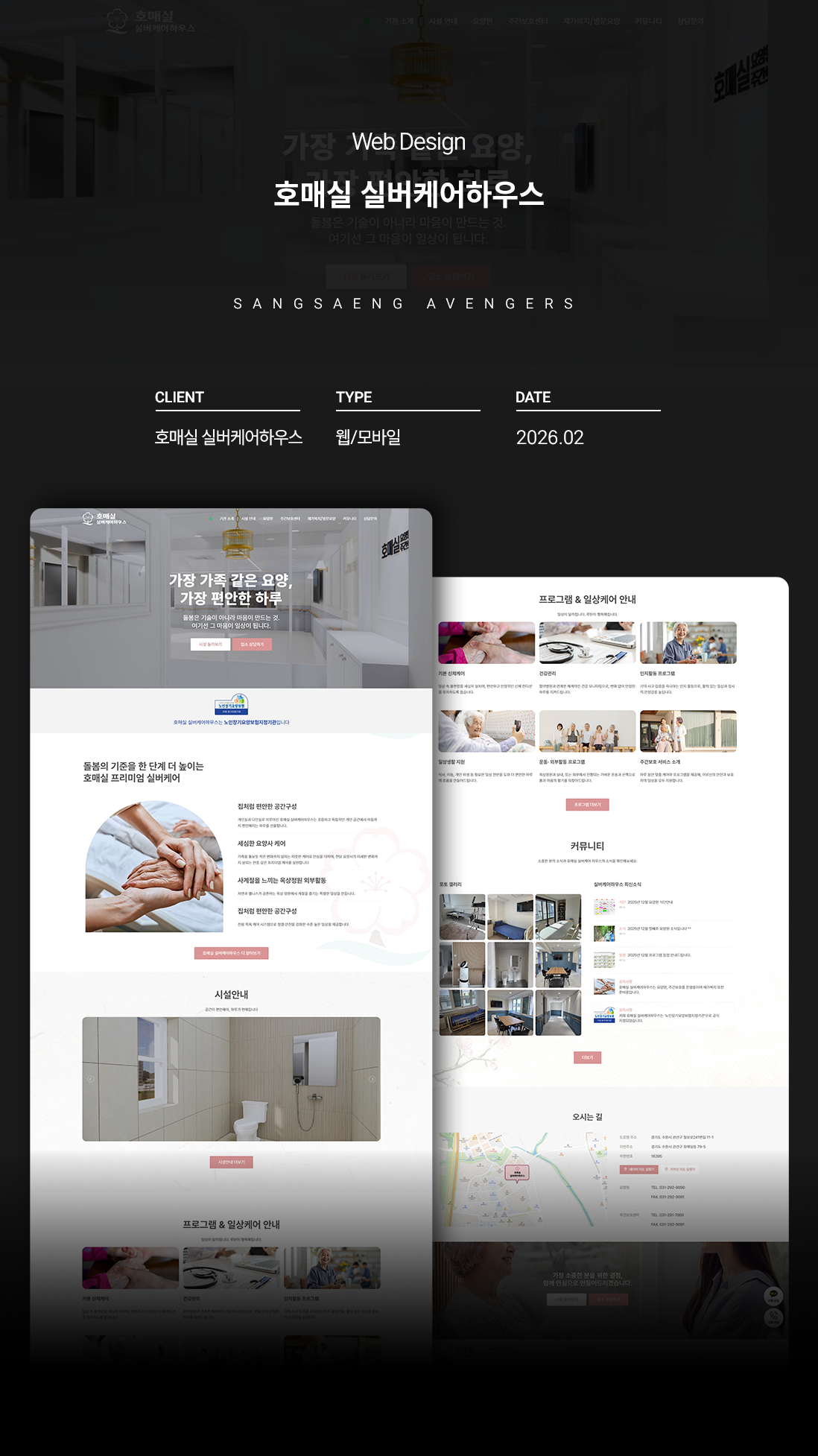 호매실 실버케어하우스의 신뢰성을 강조한 홈페이지를 디자인 및 제작하였습니다.